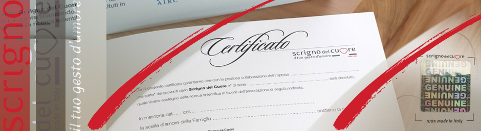 Il Certificato presenta l’iniziativa adottata da Scrigno del Cuore per raccogliere fondi da destinare a uno degli enti indicati: quattro istituti di ricerca, di acclarata fama, da sempre impegnati in prima linea per preservare la salute della collettività.
